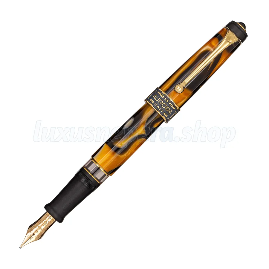 Fountain pen with 18kt. solid gold nib. Cap and barrel in amber and black auroloide. Gold trims. Onyx set on the cap.