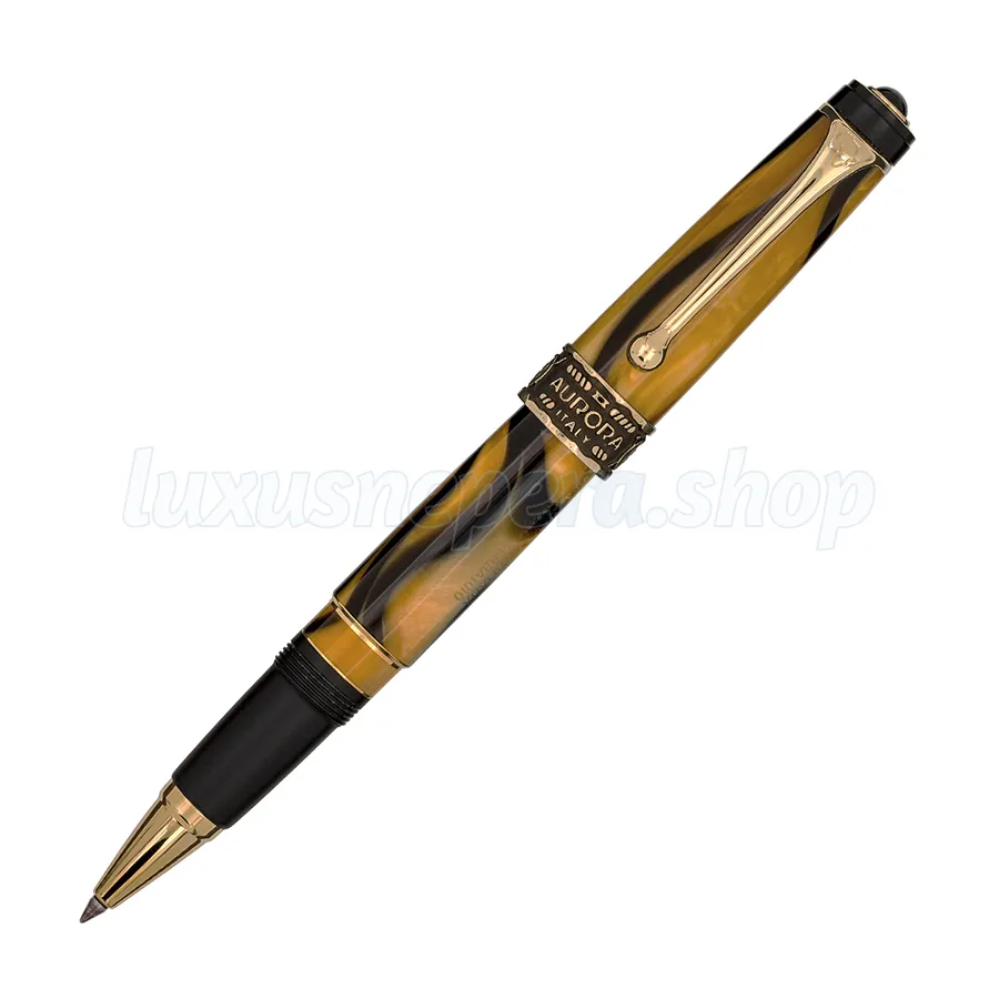 Roller with cap and barrel in amber and black auroloide. Gold trims. Onyx set on the cap.