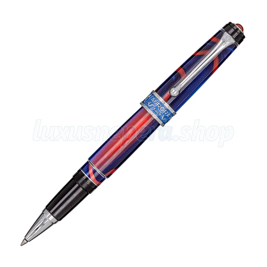 Roller with cap and barrel in red, white and blue auroloide. Chrome trims. Red jasper set on the cap.