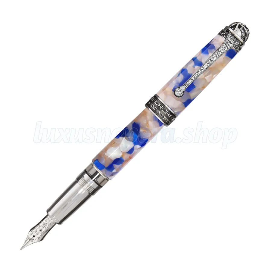 Fountain pen in beige and blue marbled Auroloide with 18kt solid gold nib, rodhium treated. Sterling silver 925‰ trims. Special armillary head and bottom depicting the rose of wind in solid 925‰ silver. Limited edition of 680 pieces.