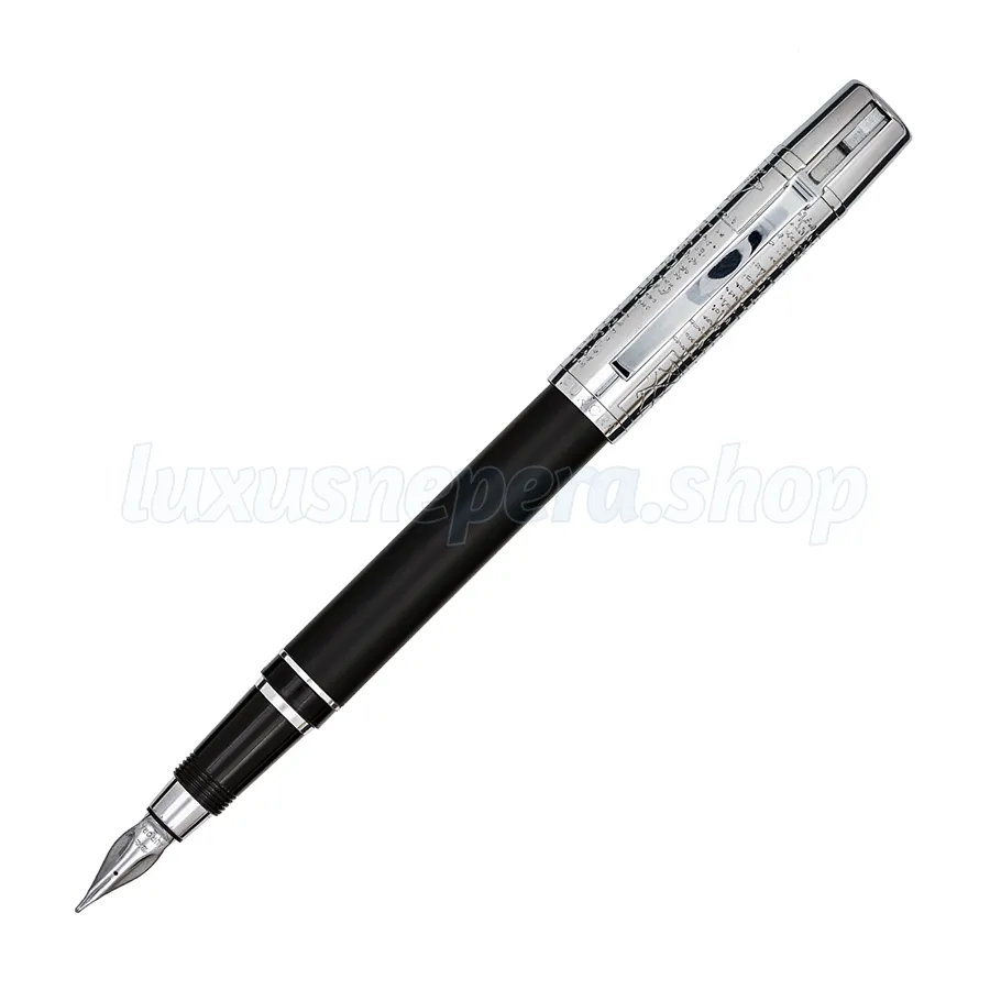 Fountain pen with 18kt. solid gold nib, rhodium-treated, Chrome cap characterized by engraving, barrel in black resin. Chrome trims.