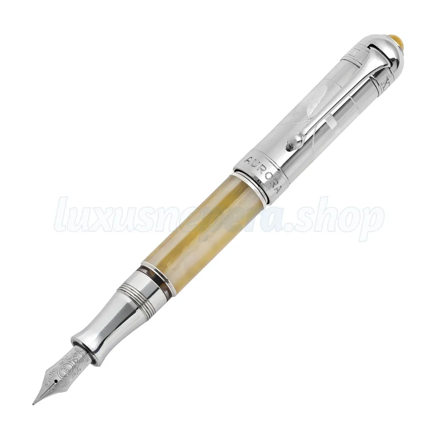 Fountain pen with 18kt. solid gold nib rhodium-treated. Sterling silver cap and barrel in striped travertine resin. Chrome trims.