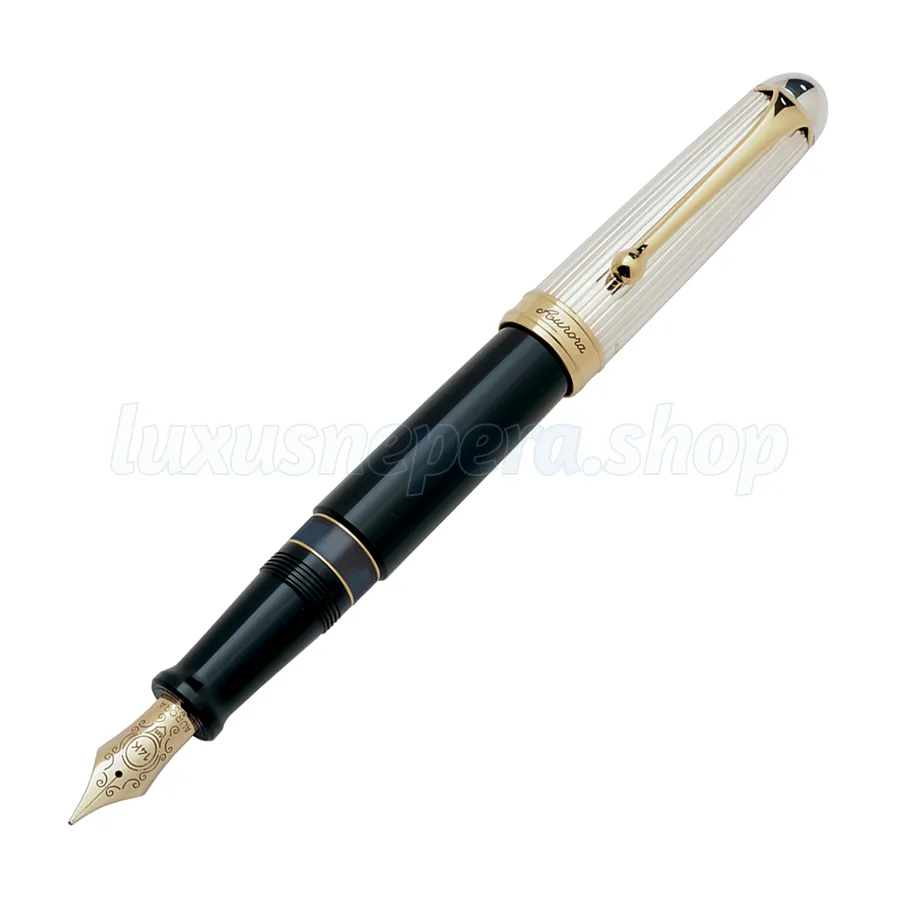Big fountain pen with 14kt. solid gold nib. Cap in solid 925 ‰ sterling silver, linear guilloché and barrel in black resin. Gold trims.