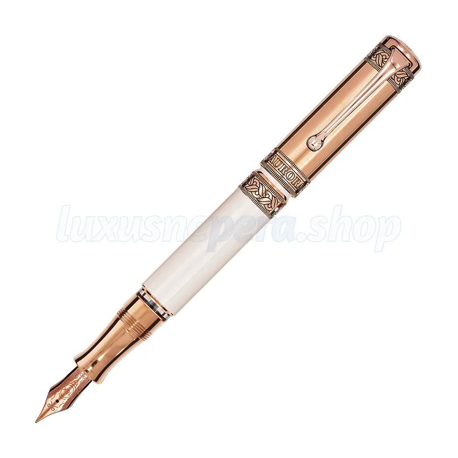 Fountain pen with 18 Kt. solid gold nib rose gold plated. Rose gold plated grip section and cap. Barrel in white lacquer, rose gold plated trims. Limited Edition of 1.265 pieces.