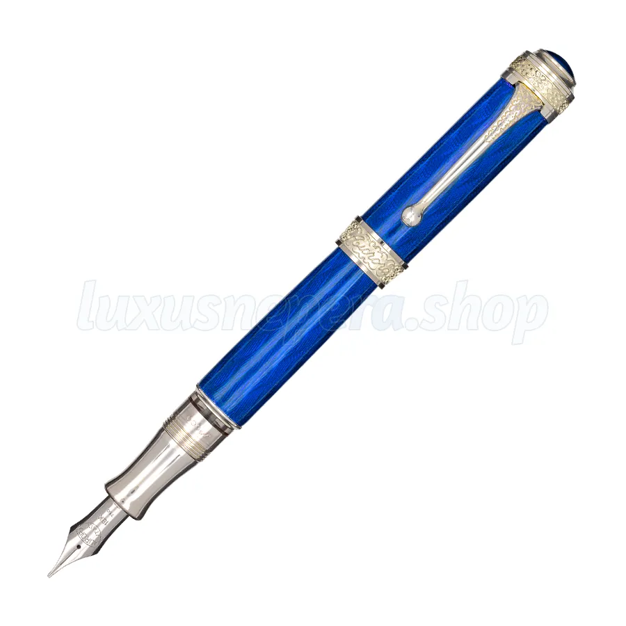 Fountain pen in solid silver 925‰, "amé" guilloché, cap and barrel in blue glazed lac quer, solid silver trims. 18kt. solid gold nib rhodium-treated. Limited edition of 919 pieces.