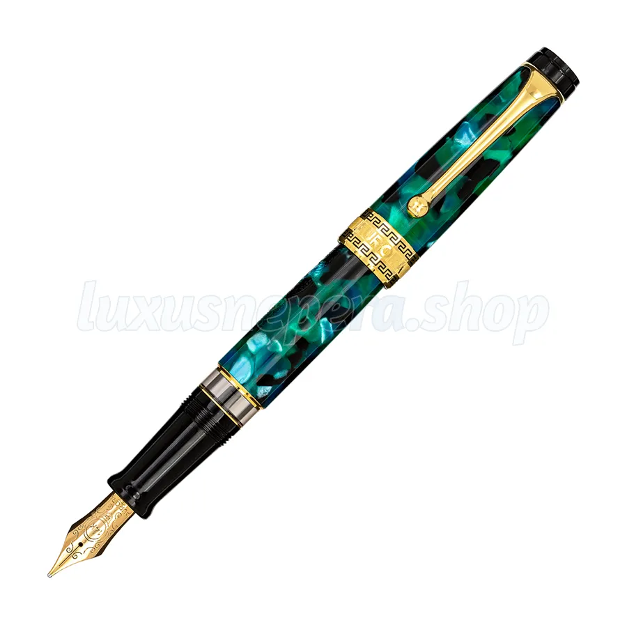 Fountain pen with 14kt. solid gold nib. Cap and barrel in green auroloide. Gold trims.